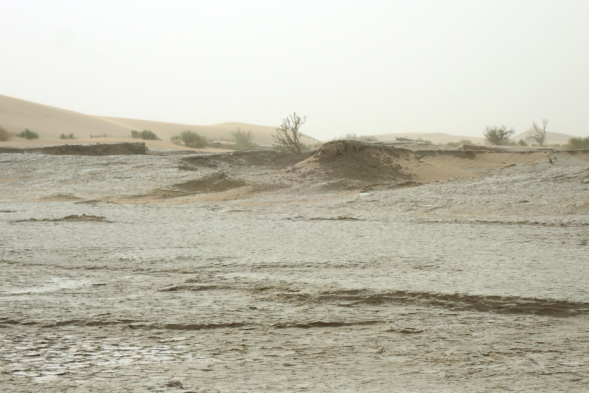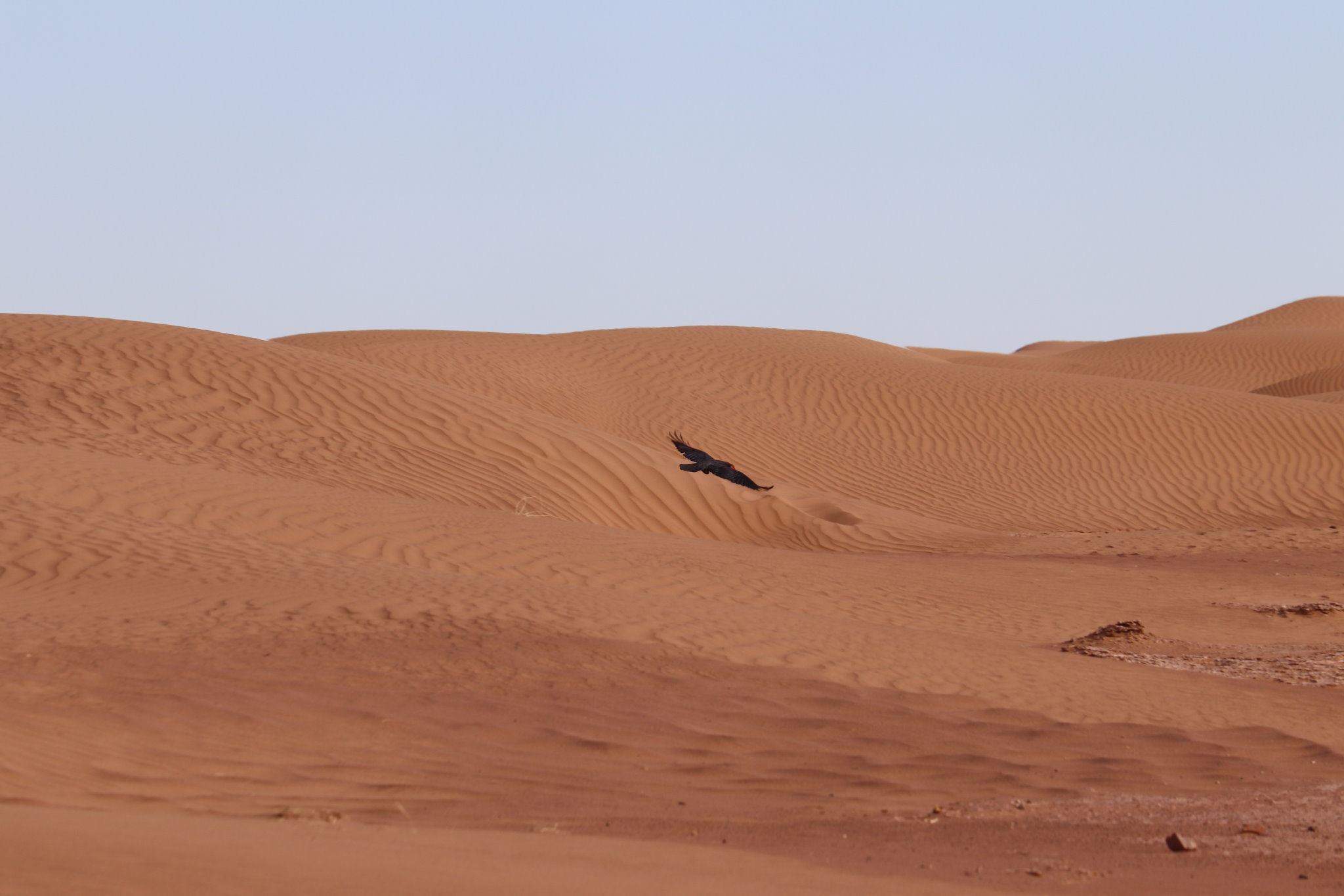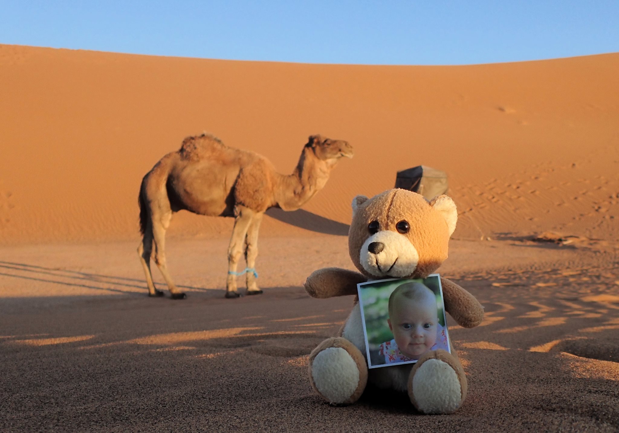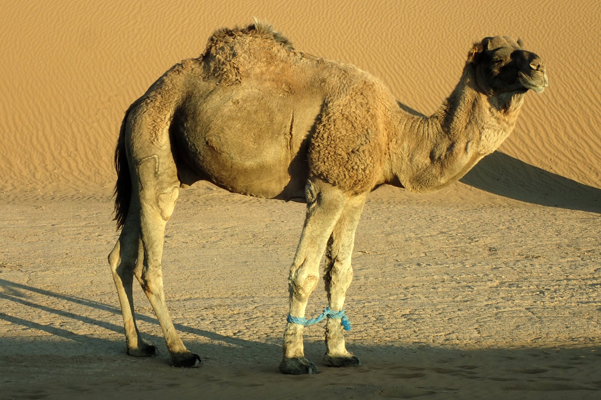 Le vent s’est levé vers 1h du matin. La nuit a été agitée et la tente s’est à moitié effondrée. On lève le camp vers 9h, les affaires pleines de sable et de poussière. On croise un dromadaire et son petit, appartenant probablement à des nomades. Le dromadaire sauvage n’existe plus depuis longtemps. Le jeune ne doit pas pas avoir plus d’une semaine mais tient déjà sur ses pattes, même si la marche reste hésitante. Choupette devrait en prendre de la graine.