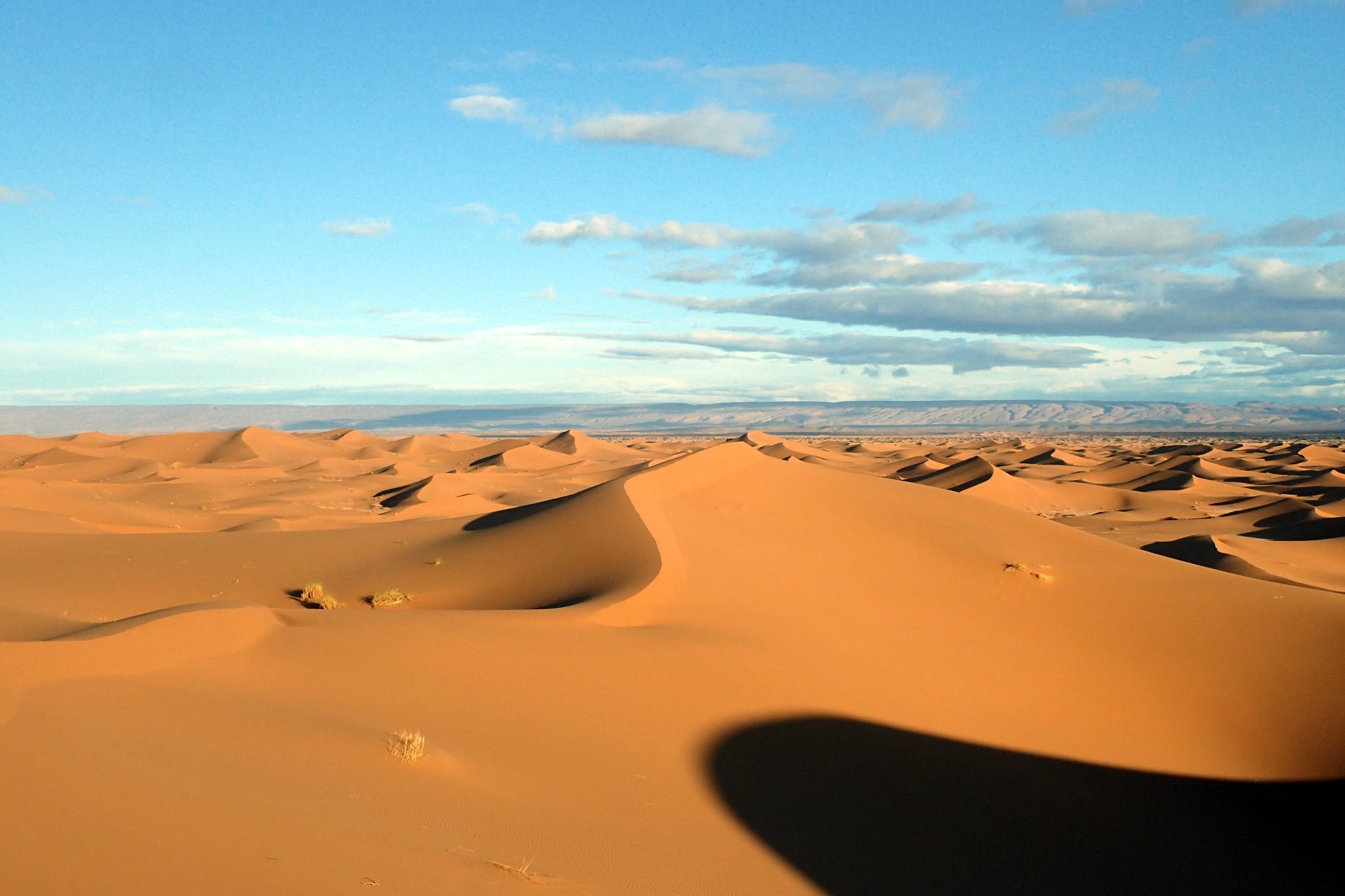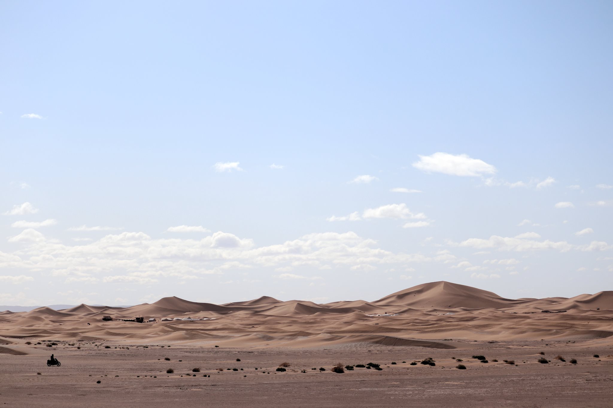 Nous quittons les dunes pour un plateau. Le coin est plus touristique, des campements permanents ont élu domicile et accueillent les touristes de passage. Nous croisons quelques 4×4 et un berger avec ses chèvres et son scooter. En haut d’une colline nous attend un reg, vaste plaine de cailloux qui nous rappelle un peu l’Islande. C’est partie pour 2h de marche sur un billard plat et monotone pou arriver enfin à la pause de midi. Enfin… de 14h30.