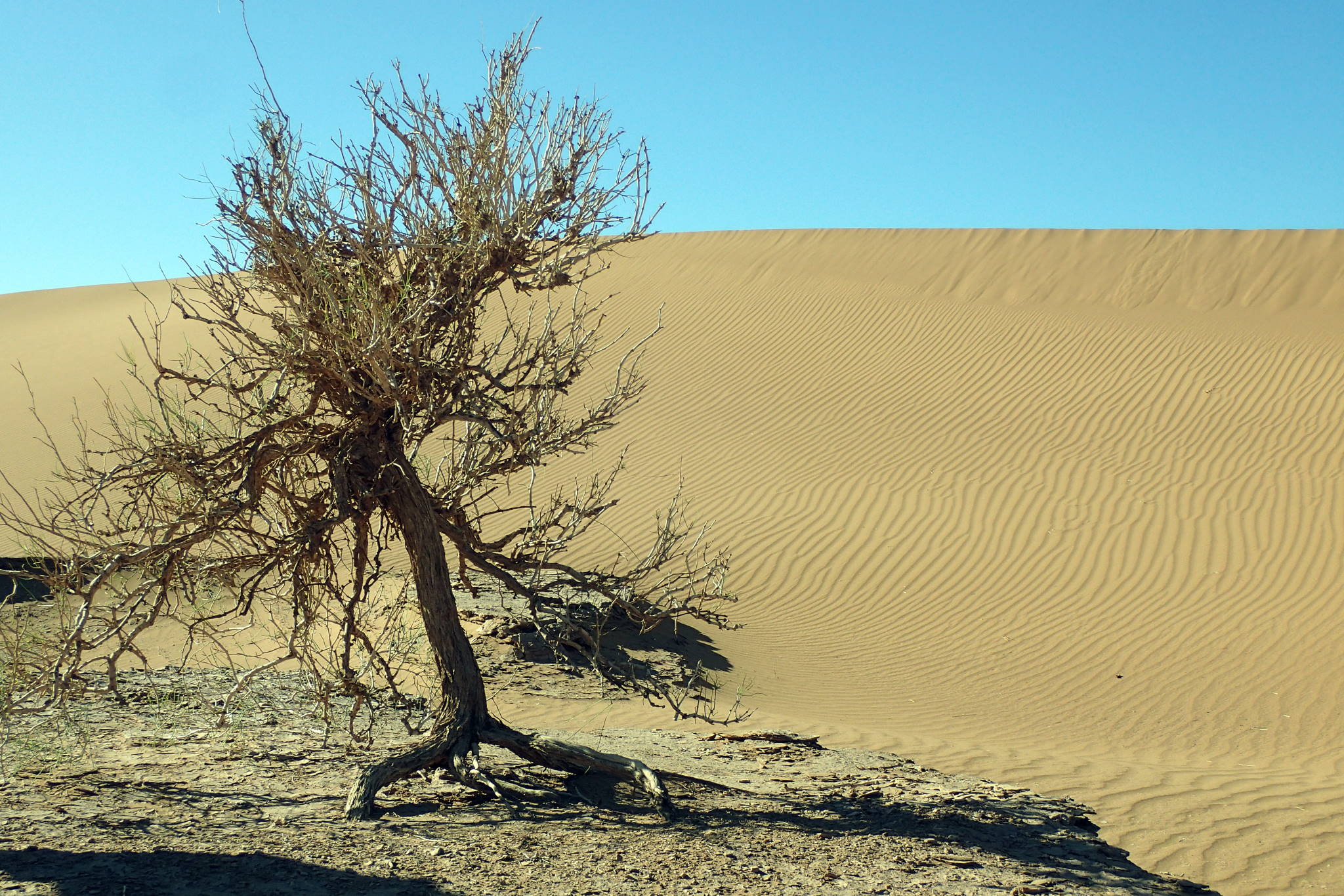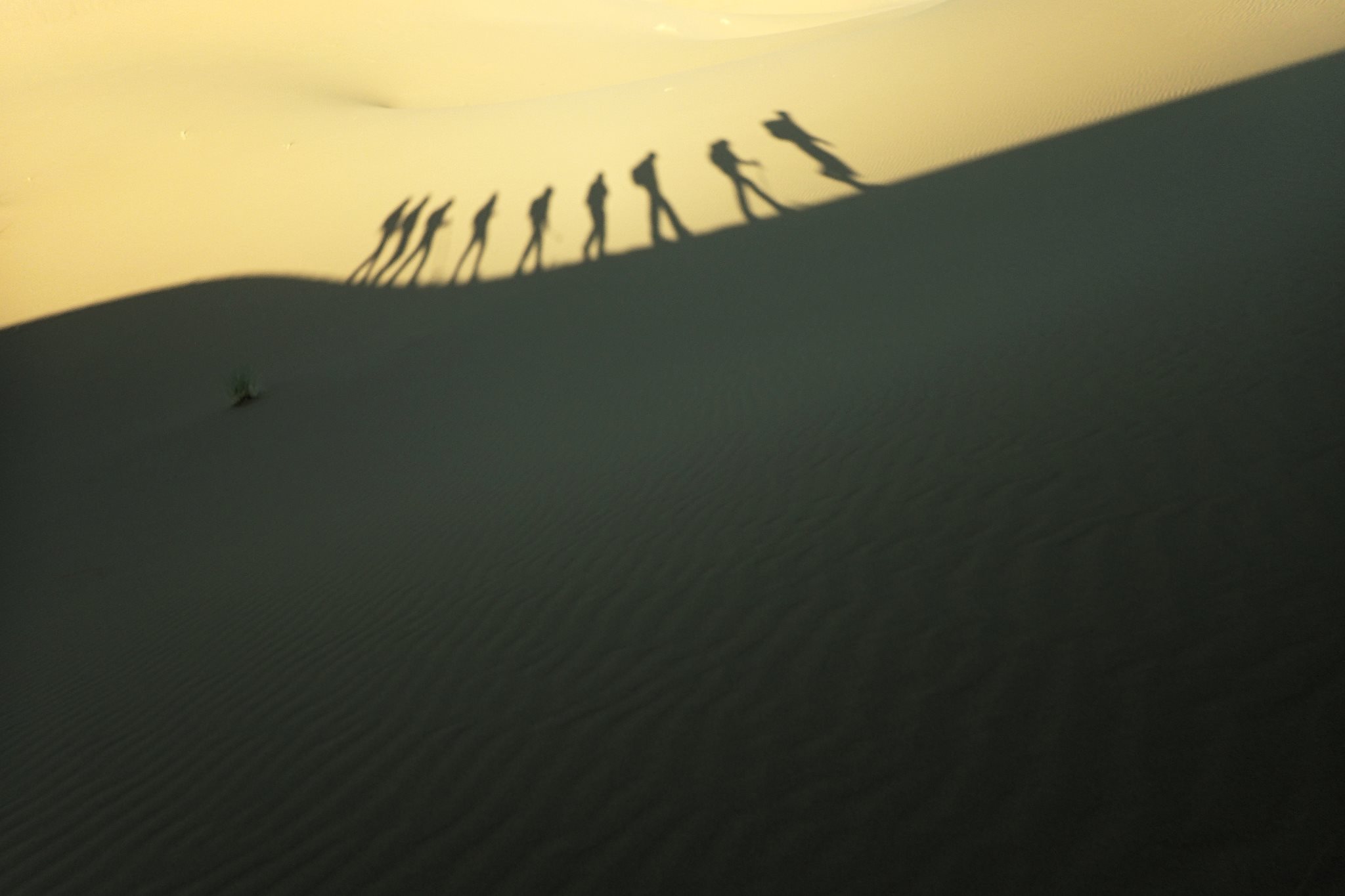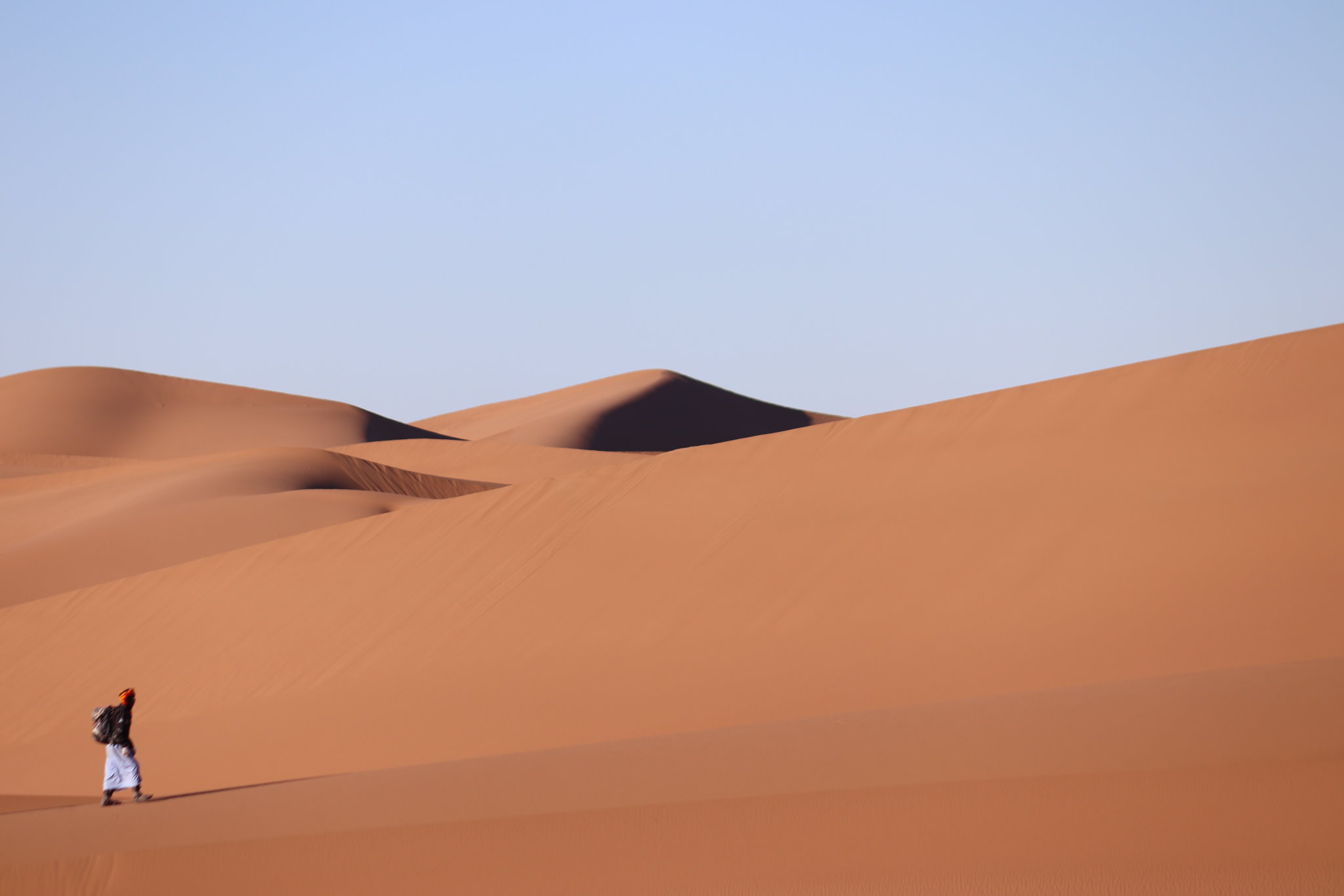 Très bonne nuit. On commence par des dunes, histoire de changer… On sent la fatigue s’installer dans le groupe. Le rythme est moins soutenu, les pauses plus fréquentes. Beaucoup de dunes et peu de plateaux, ce qui rend la marche assez difficile. Un arbre faisait office de point de repère avant. Il grandissait avec la dune, mais elle a fini par le dépasser et les berbères ont dû se trouver un autre point de repère.