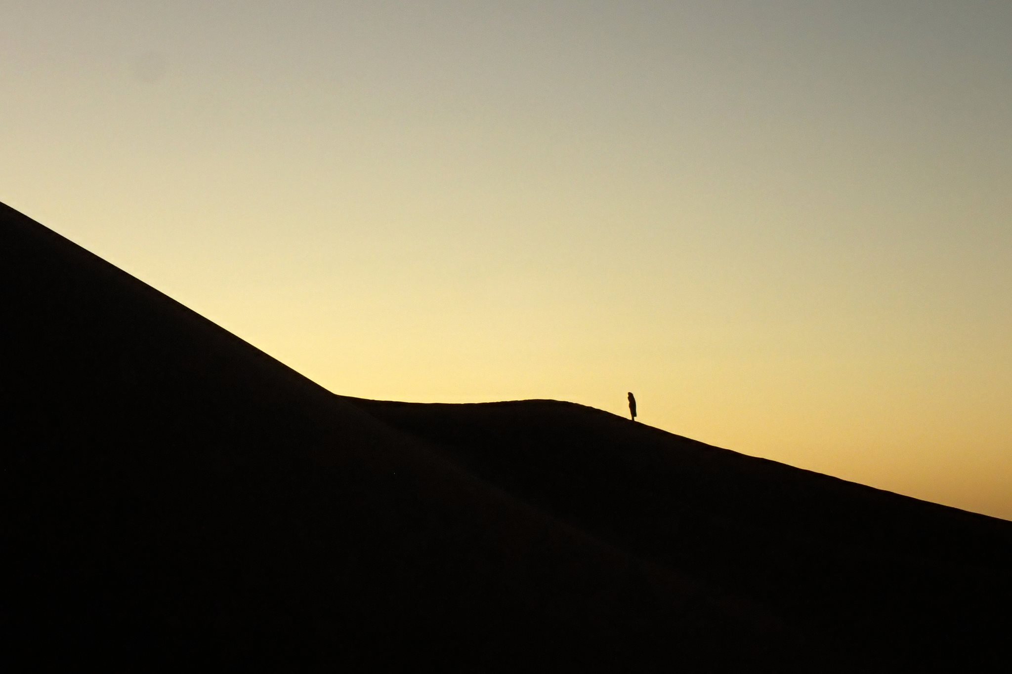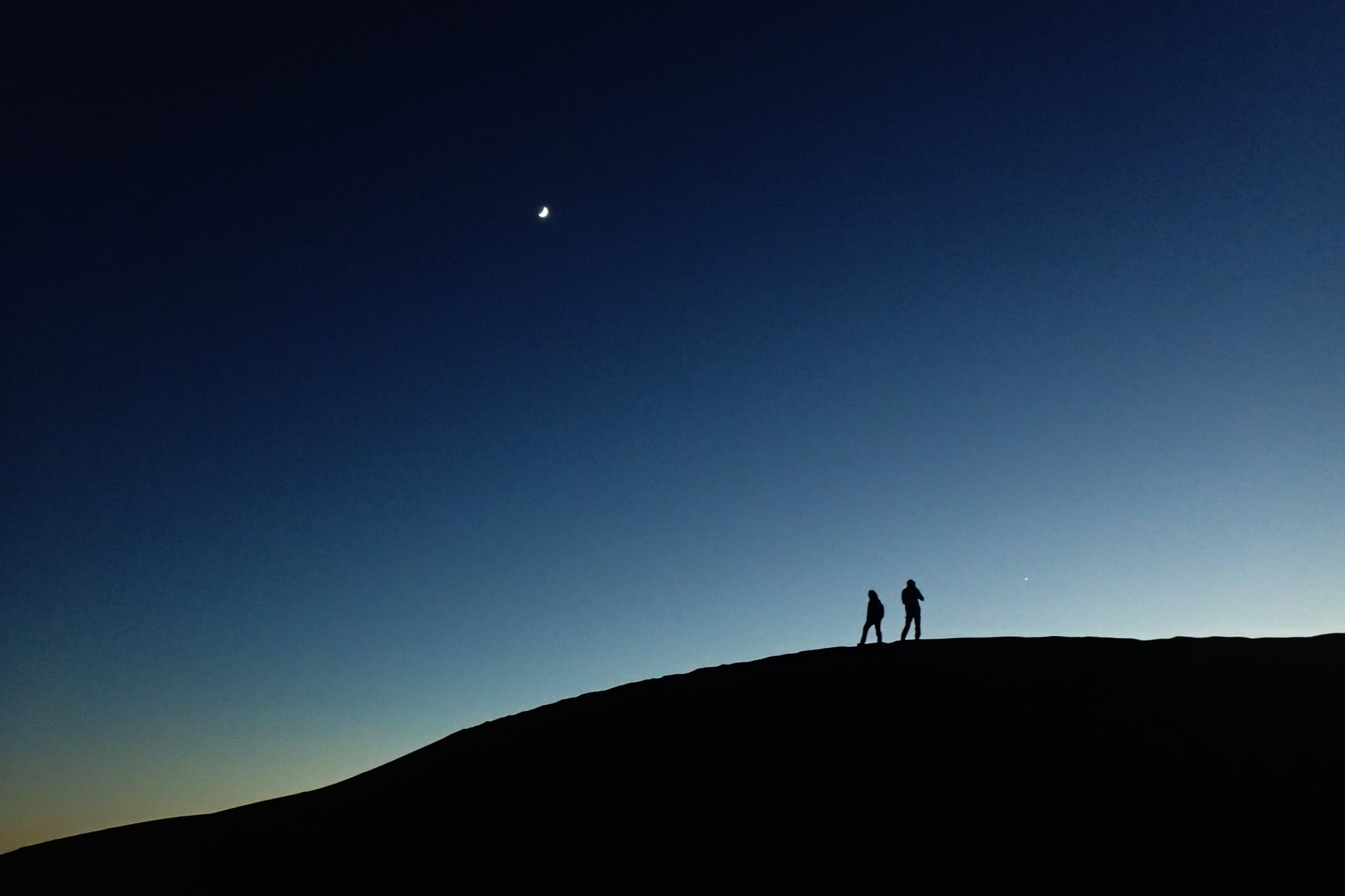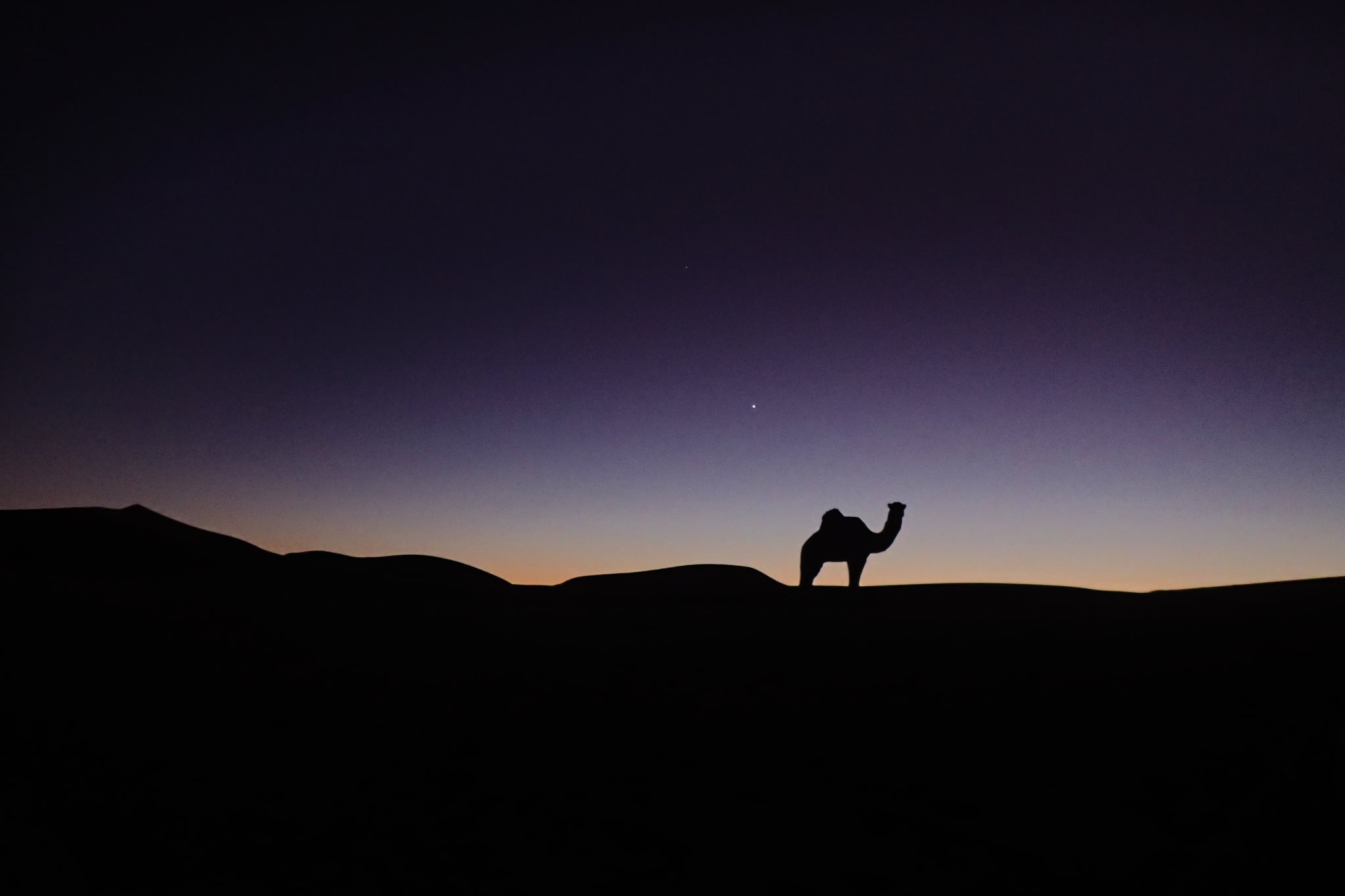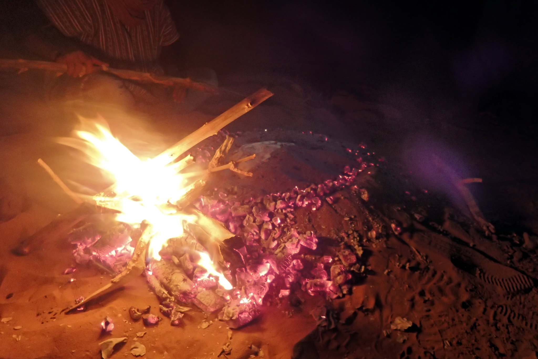 Après une longue pause, nous grimpons en haut des dunes pour admirer le coucher de soleil. Nous attendons patiemment ces quelques minutes irréelles de crépuscule ou le ciel semble s’embraser avant de s’assombrir et dévoiler les premières étoiles de la nuit. De retour au camp, les berbères nous acceptent avec plaisir autour de leur feu et nous assistons silencieux à la préparation du pain cuit à même le sable.