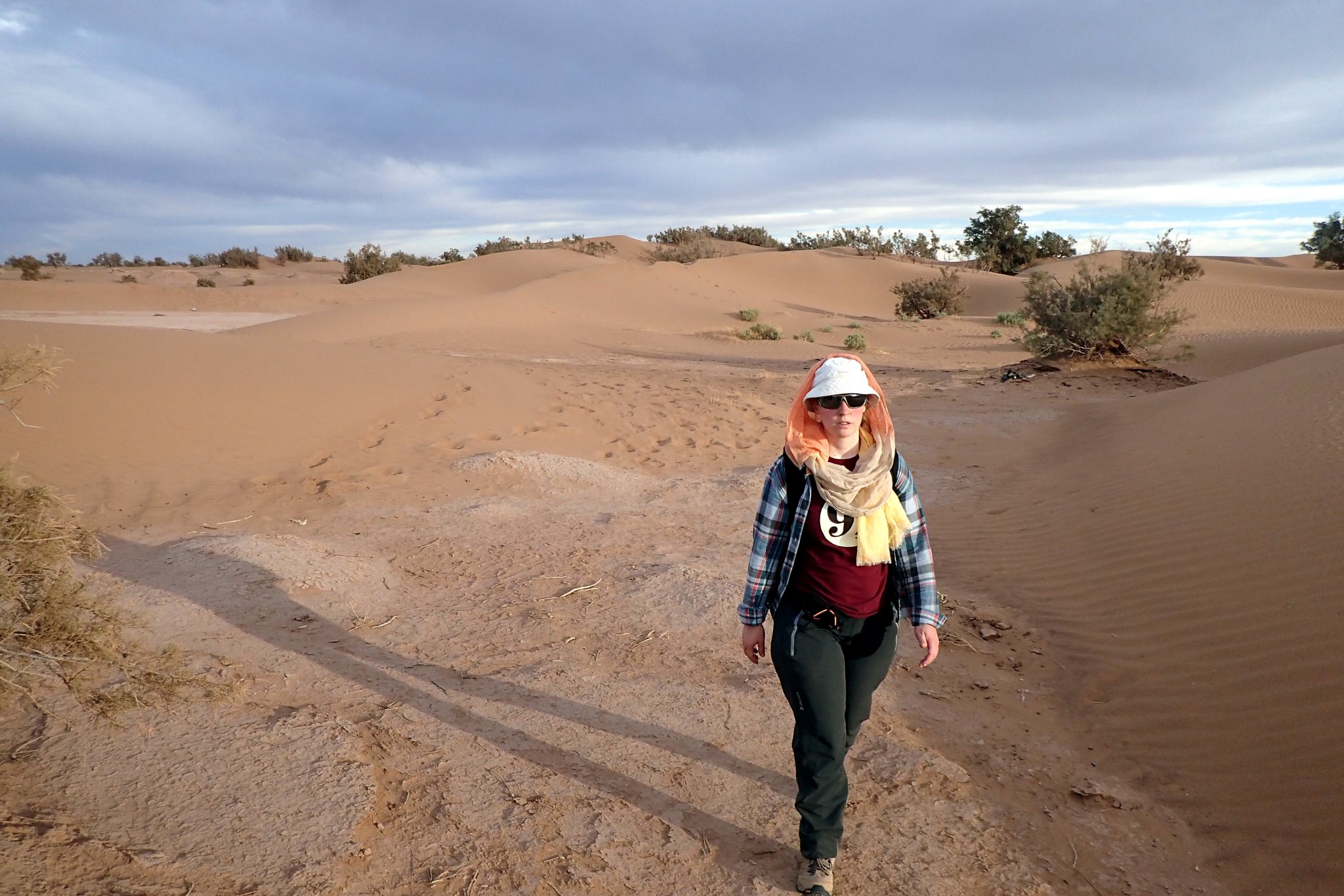 On repart à 16h, fatigués mais rassasiés. Les jambes sont lourdes et les pieds douloureux. On traverse au passage la forêt la plus inutile du mode : le pommier de Sodome est trop fin pour se servir de son bois, trop clairsemé pour faire de l’ombre et ses feuilles sont toxiques. Nous arrivons au campement après 1h30 de marche. Roger le dromadaire pose pour la photo et une chatte du campement voisin vient quémander quelques caresses. Elle est profite pour manger un oiseau