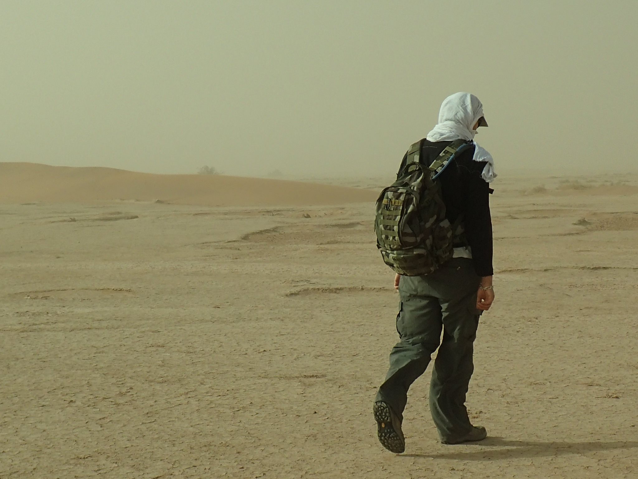 Le vent ne se clame pas après la pause déjeuner. On arrive sur un plateau immense et désertique. Nous marchons des heures, le sol balayé par le vent soulève un nuage de poussière qui rend la respiration difficile et limite la visibilité à quelques dizaines de mètres. Le vent faiblit et nous arrivons enfin au camp. La Gazelle fatigue comme dirait Sallam…