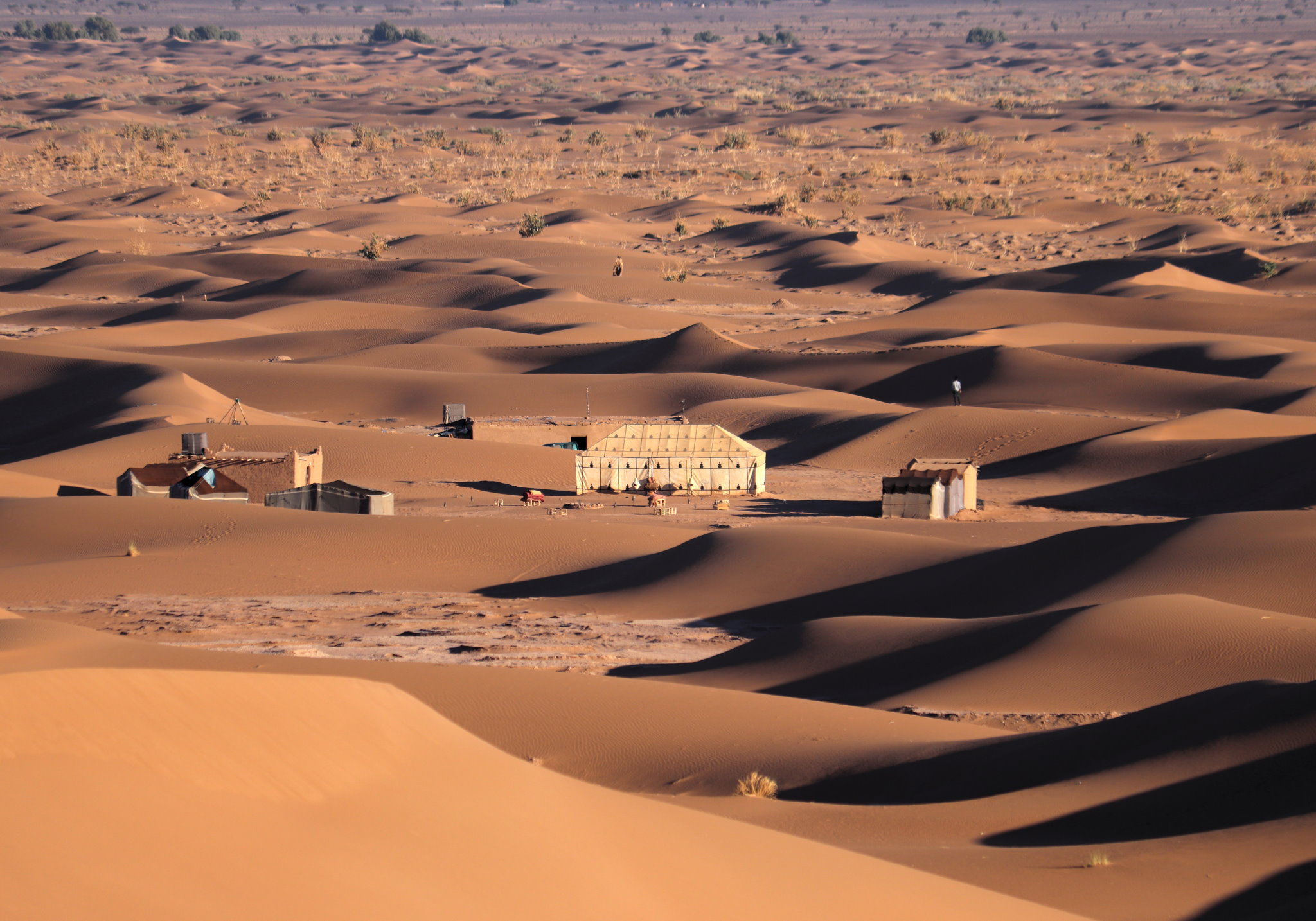 Le soleil monte et le vent faibli. Vers midi, il n’y a plus d’air et pas plus d’ombre. Pas de pause non plus, il faut atteindre le camp directement. Nous marchons dans le sable sous un soleil de plomb. Il faut avancer, pas après pas, inlassablement, sans s’arrêter au risque de ne pas repartir. Les dernières dunes sont éprouvante. Laure est à bout de force. Choupette la porte jusqu’au bivouac où elle s’effondre dans la tente commune. Le thé est plus que bienvenu.