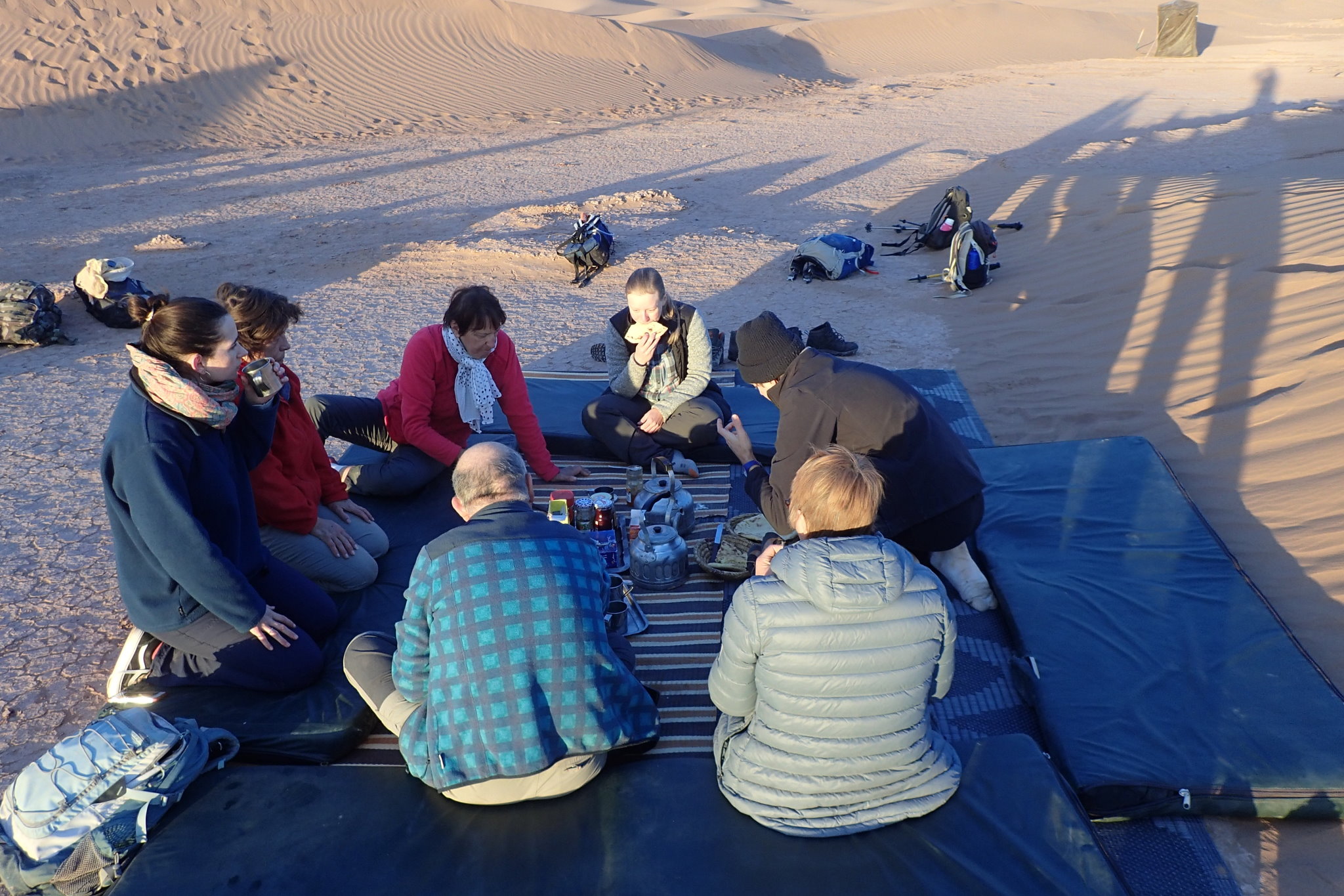 Nous faisons halte au café-restaurant-bivouac Titanic, oasis surréaliste posée au milieu du désert. Nous repartons vers l’est en direction de l’Erg Chigaga. Nous arrivons rapidement au bivouac en milieu d’après-midi. « Déjà » s’étonne le groupe. Déjà la fin de la journée, déjà la fin du voyage.