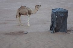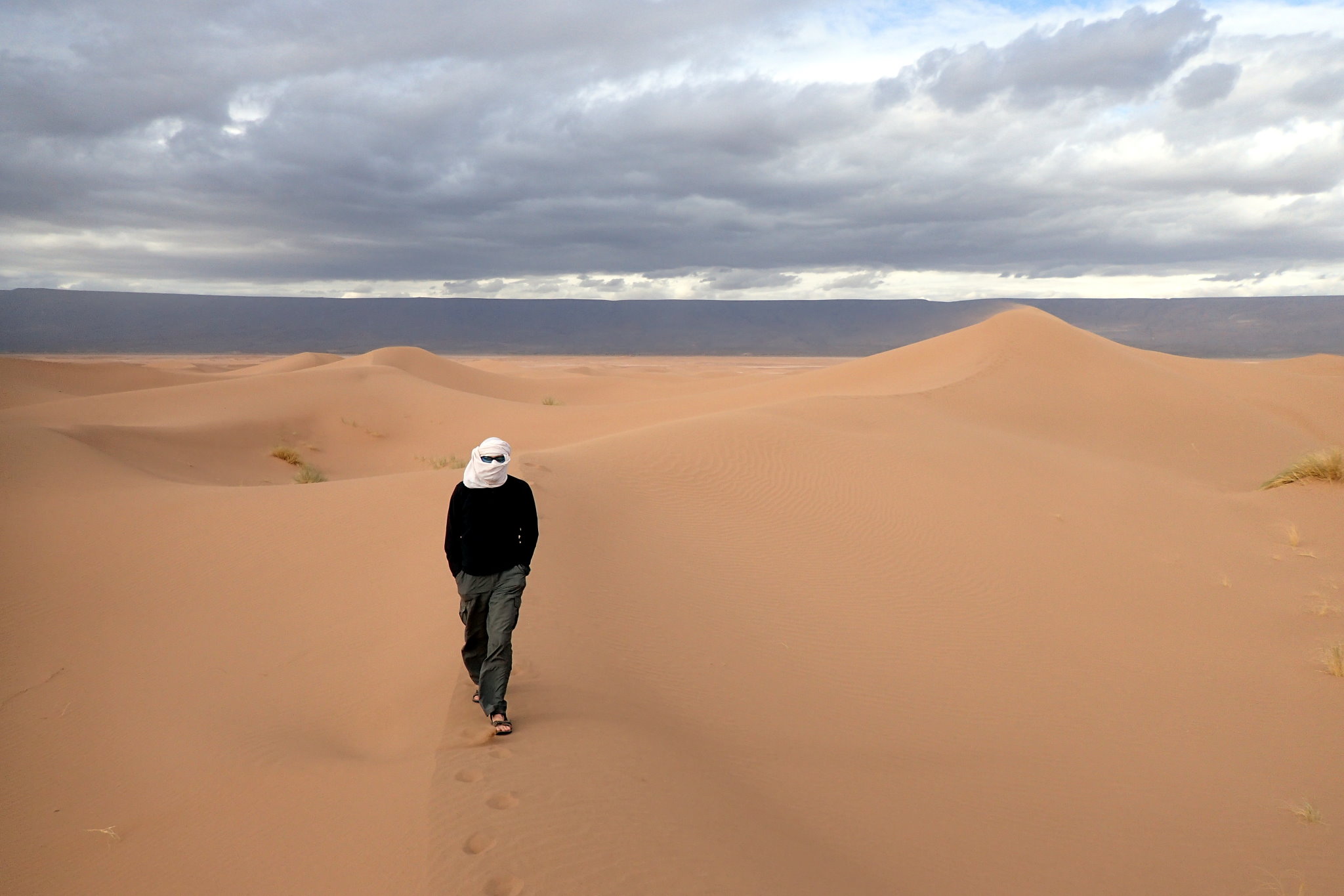Après manger, nous allons faire un tour dans les dunes. Le vent se lève, le ciel est nuageux. Ca sent la fin. On se sent tout petit dans le désert. Laure se perd en revenant à la tente. Une nuit sans lune, sans point de repère, toutes les dunes se ressemblent. Elle finit par apercevoir la lampe frontale du guide du haut d’une dune et rejoint le camp de base,