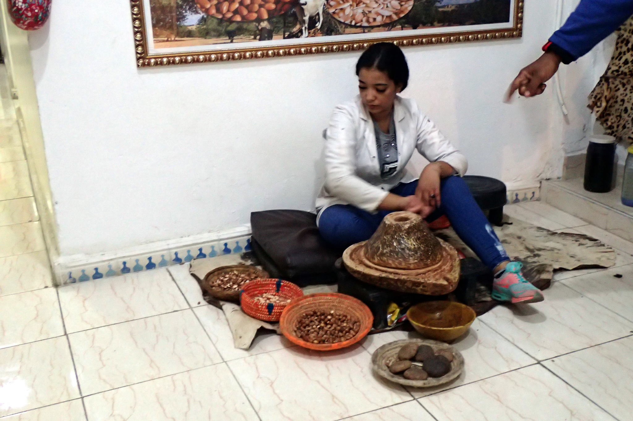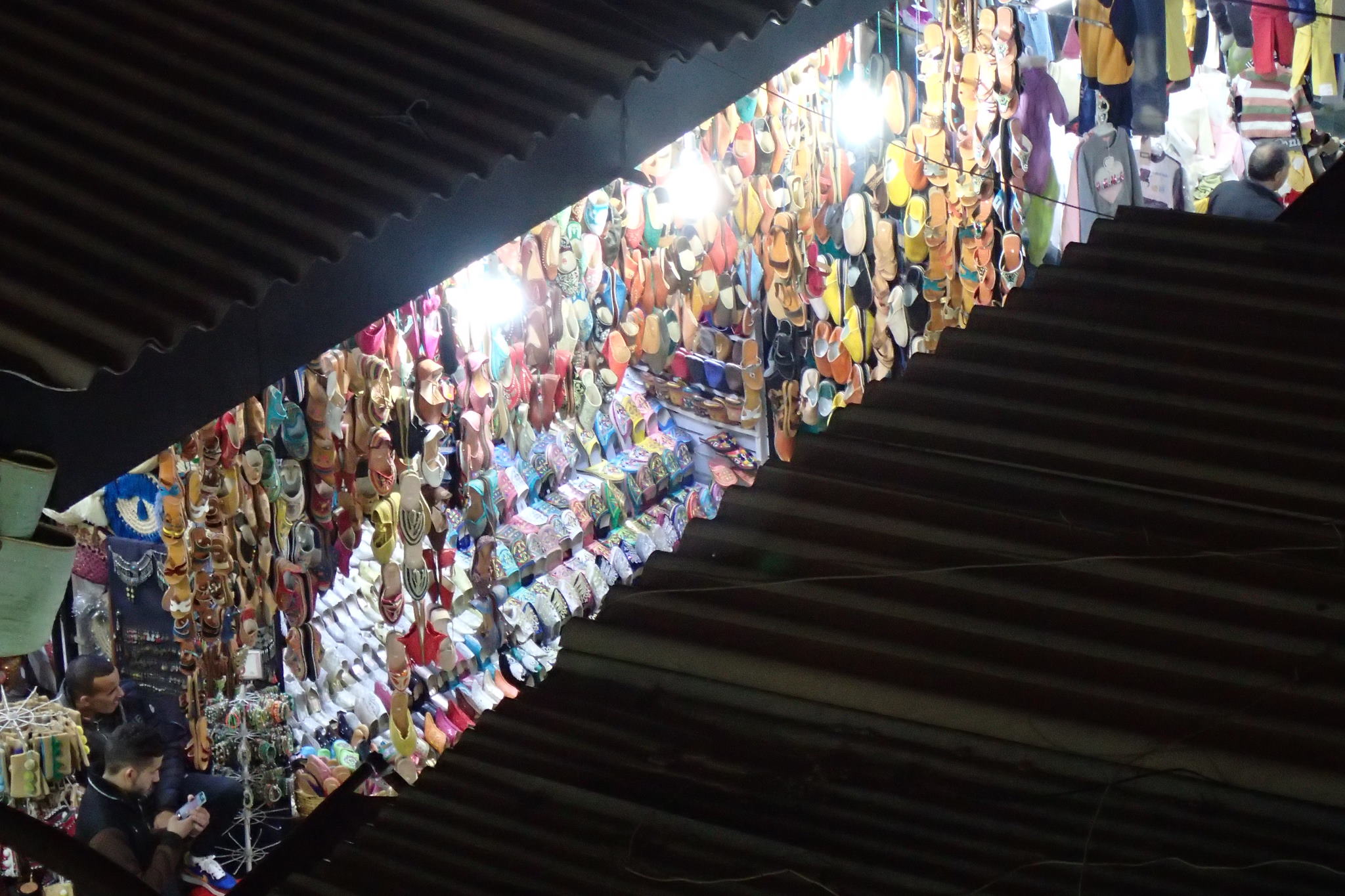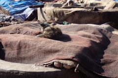 Nous voulions visiter la medersa Ben Youssef mais celle-ci était fermée pour rénovation. On nous oriente vers le quartier des tanneurs. Sans vraiment comprendre, nous nous faisons embarquer dans une visite guidée au pas de course. Nous offrons à la fin un dirham symbolique pour se débarrasser du « guide » qui râle de ne pas avoir plus. Il doit faire son cinéma quelque soit le montant du pourboire… Etant dans le quartier, Thibaut en profite pour chercher une chute de cuir de dromadaire. On lui propose une peau entière 2000 dirham. Pas pratique dans l’avion. On apprendra plus tard d’un maroquinier que ce produit se négocie plutôt autour des 500 dirham.