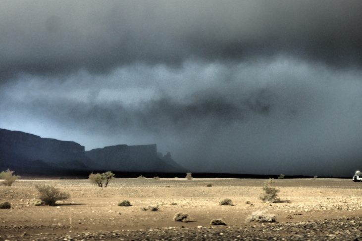 Après 3h de piste et la traversée de quelques oueds, nous rejoignons la route goudronnée, inondée par endroit. Nous quittons les 4×4 pour le mini bus. Le transfert est gratuit mais pas le pourboire normalisé de 30 dirham par personne. Les Français ne s’habitueront décidément jamais à ce type de commerce pourtant très répandu dans le monde…