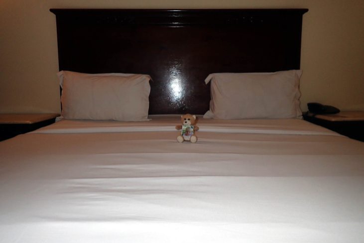 Nous arrivons enfin à l’hôtel après 9h de route et quelques arrêts imputables au baby-boomer occidental moyen. Nous prenons une douche salutaire et allons manger au restaurant de l’hôtel honteusement cher, mais les pieds n’ont plus le courage d’aller plus loin.