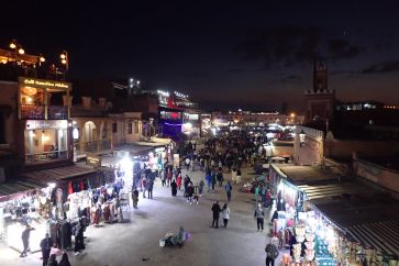 Nous revenons sur la place Jemaa el-Fna vers 17h qui est maintenant bondée à cause du festival du film de Marrakech. Nous mangeons sur la terrasse d’un restaurant en hauteur avant de rentrer à l’hôtel.