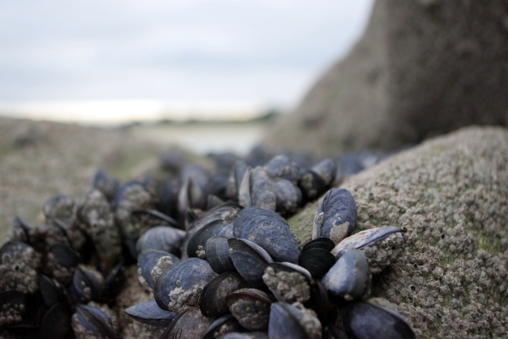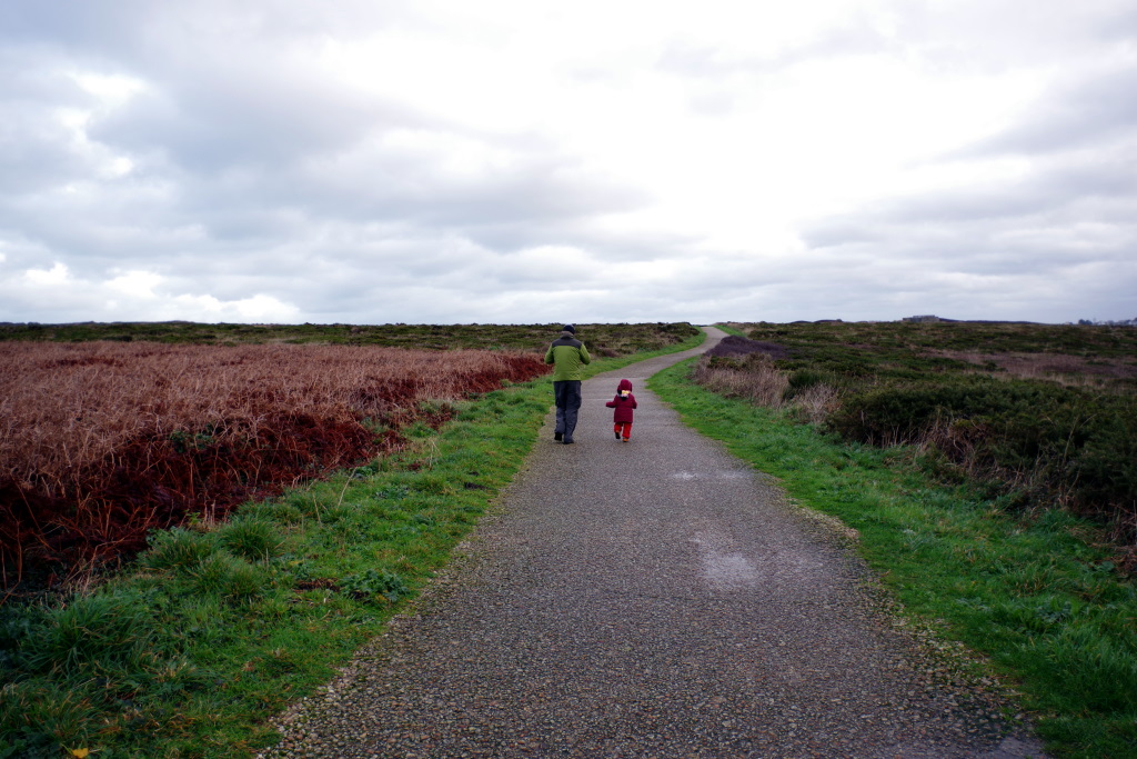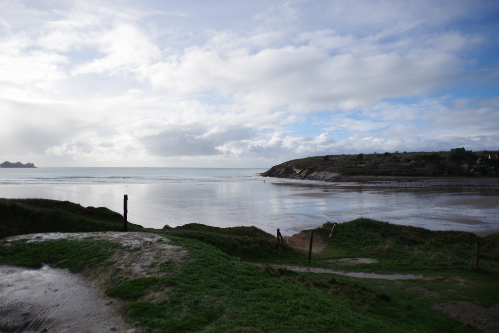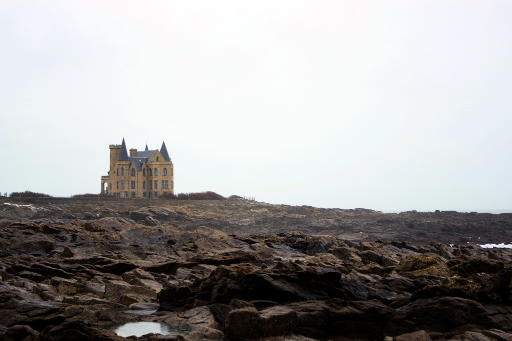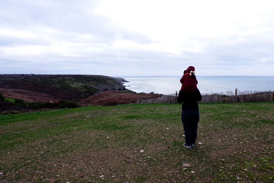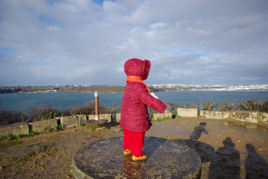 Il pleut, il flotte, il drache, bref, un temps breton. Pause midi je sais plus où pour manger de la purée de brocolis suivi d’une balade humide sur la côte au château Turpault construit par Maman (d’après la petite… elle est forte Maman….).
