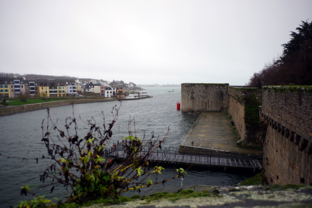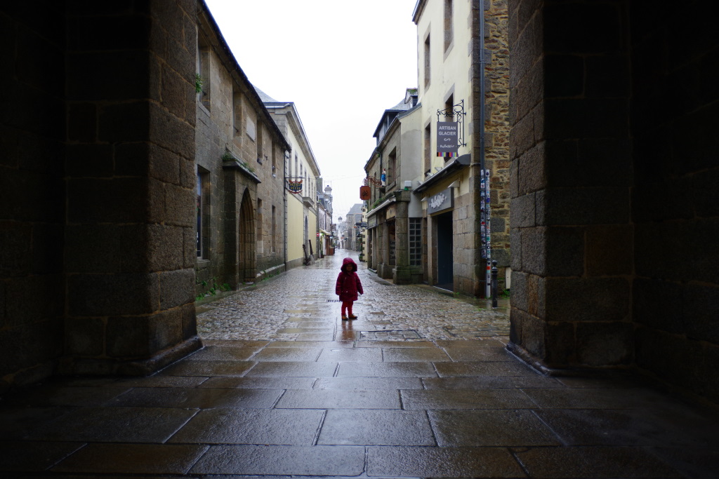 Il fait plus chaud en bas que dans la couchette du haut. Départ sous la pluie. Il pleut. On mange une crêpe bretonne à Douarnenez. Y’a pas, les bretons ils s’y connaissent en crêpes. On repart sous la flotte. Visite sous la pluie d’une cité fortifiée.