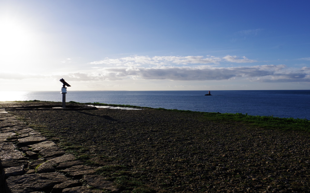 Je tente de remplir la cuve à eau du van avec le tuyau d’arrosage, en vain. Tant pis, je verrai à la prochaine station. Nous partons sous un soleil timide qui s’affirmera par la suite. Arrêt photo au à la pointe Saint-Mathieu sous le soleil breton.