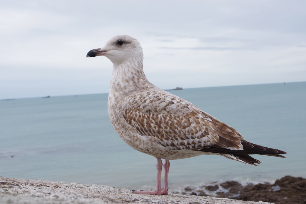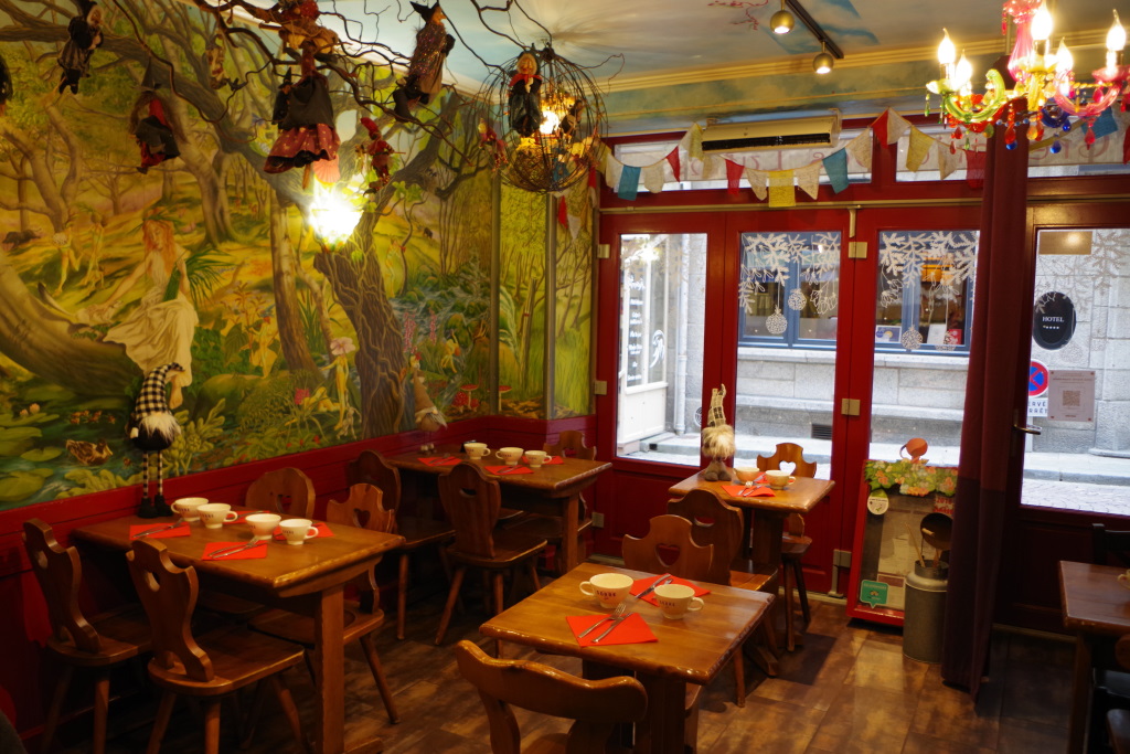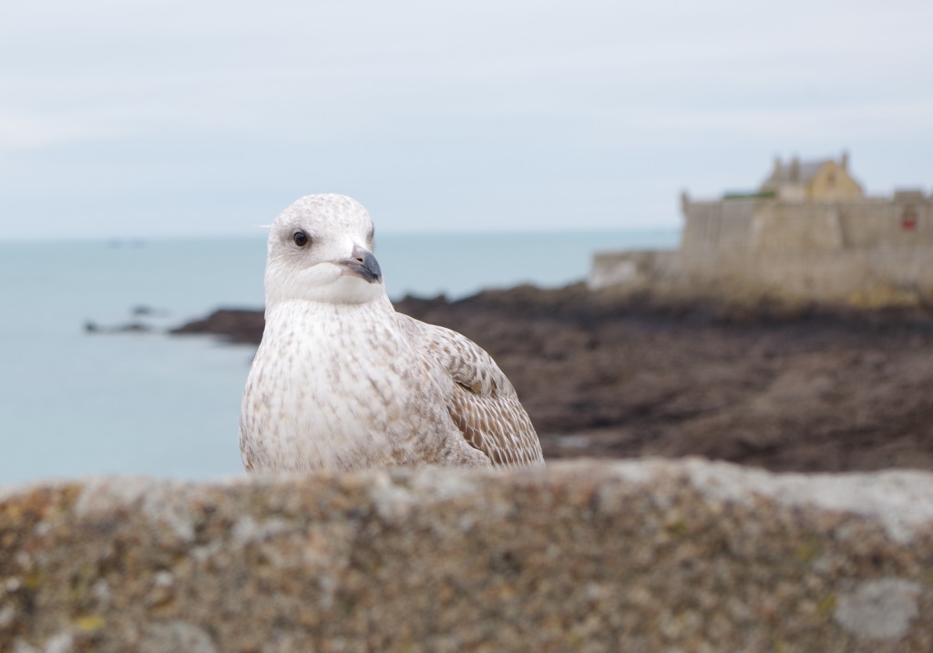 Pause déjeuner à Saint-Malo à la Crêperie des Lutins. Décor féérique mais Choupi grincheuse. Ca fait un bon gnome. On emporte sa crêpe en doggy bag. Nous nous promenons sur les remparts de Saint-Malo pour rencontrer la mouette la moins stressée du monde.