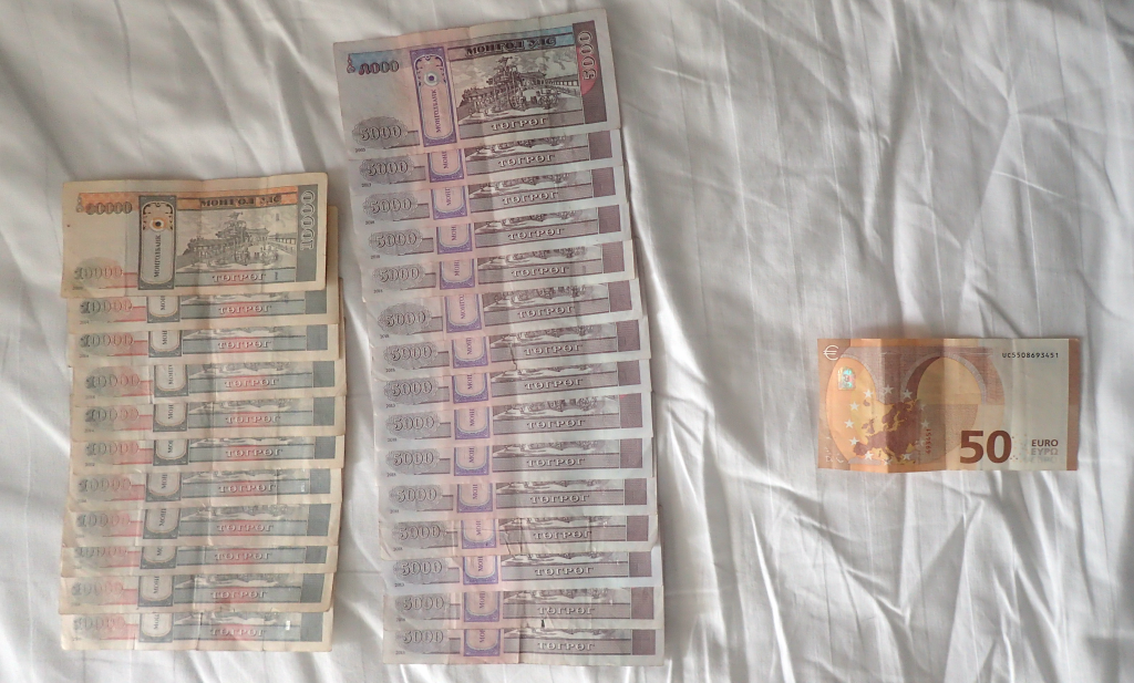 Oonoo (prononcer « Ouno »), notre chauffeur, nous dépose à l’hôtel. Notre première mission consiste maintenant à retirer du liquide, chose qui s’avère plus ardue que prévu. Nous trouvons un premier ATM dont la traduction Google Translate de l’interface nous laisse perplexes. « Enter the withdrawal value which has been divided by 1000 ». Avec un taux de change de 1€ pour 3 700 Tugrik, un retrait de « 400 » nous retourne une erreur, et nous n’osons pas tenter un retrait de « 400 000 », de peur que ce « divided by 1000 » nous génère un retrait équivalent à plus de 1000€. Deuxième tentative avec un autre ATM pendant qu’un type avec un sac de billet accompagné d’un policier fraîchement sorti de l’école remplissent le distributeur voisin. La Brinks locale quoi…