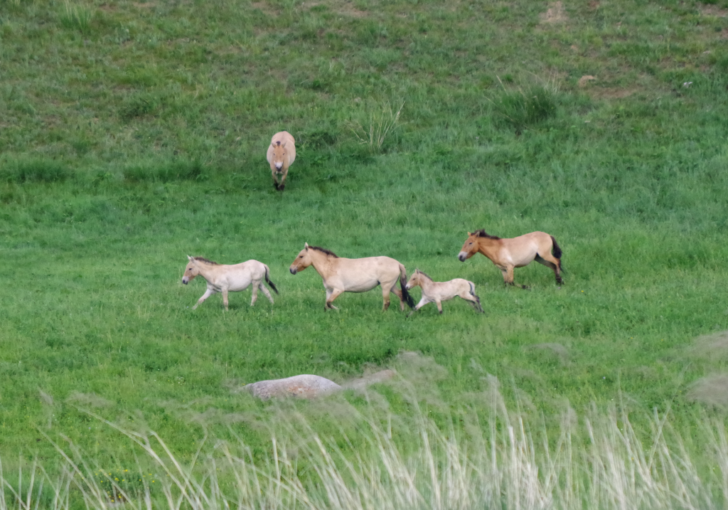Premier tour de roues avec des pneus à crampon neuf sur le bitume. Ça tortille du cul dans les virages, c’est poussif et ça tremble pour pas grand-chose. Bref, pas vraiment de quoi mettre en confiance. Arrivée sur la piste. Ça tortille du cul, c’est poussif et ça tremble. Comme sur bitume en somme. C’est là qu’on se dit que 2000 bornes de piste ou d’autoroute, l’indienne s’en préoccupera comme de sa première vidange. Elle avalera les kilomètres à son rythme avec deux ou trois coups de bottes bien placés pour redresser ce qui aurait pu être abîmé après une chute. Et des chutes, il y en aura. Mais pas aujourd’hui. Nous arrivons sans encombre à la réserve naturelle d’Hustai, où le camion russe nous emmène observer le cheval de Przewalski.