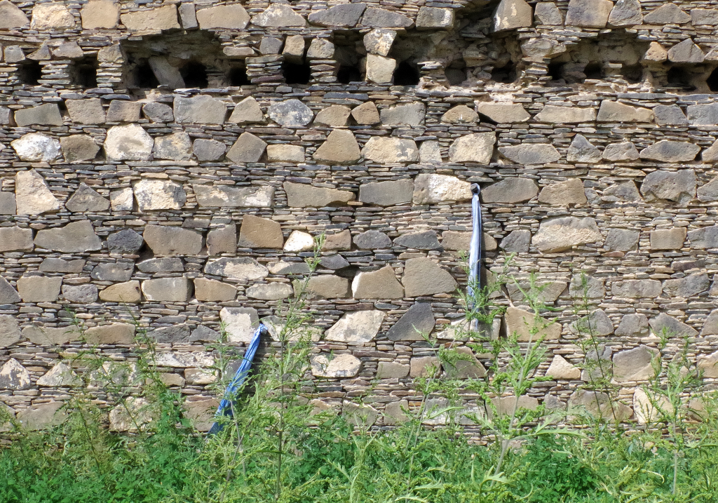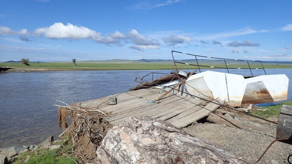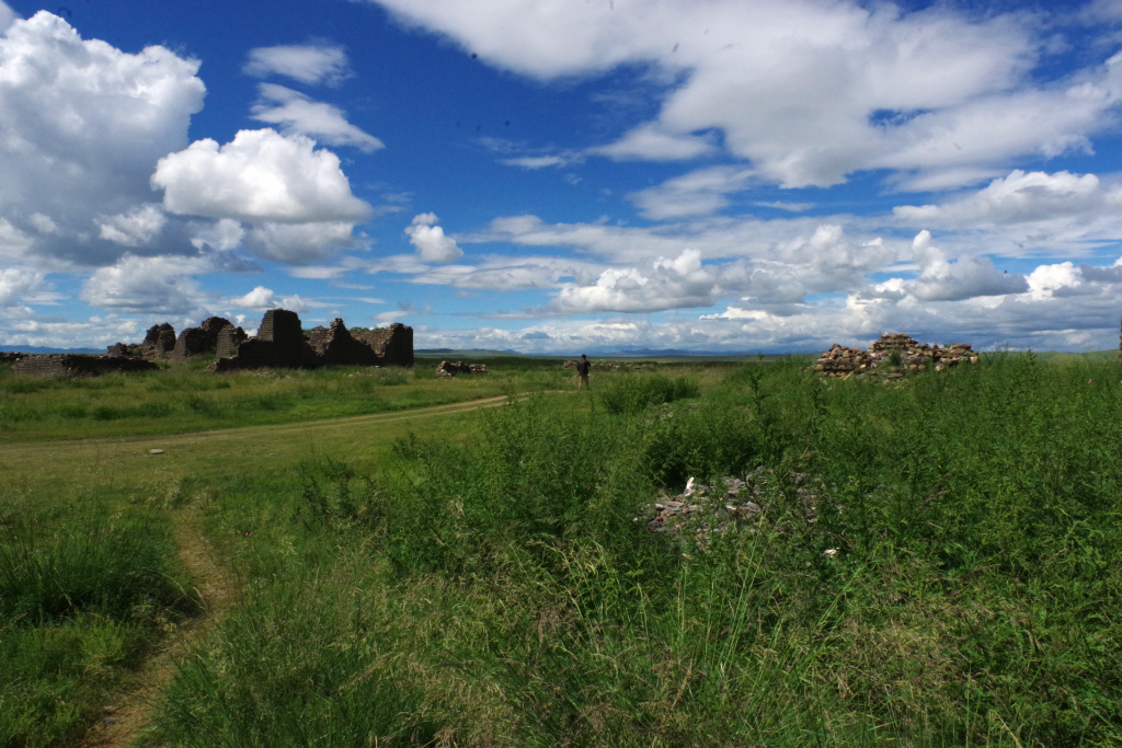 La pluie de cette nuit à mouiller la piste, ce qui nous évite de respirer la poussière avant de retourner sur le goudron. Les lignes droites alternent pluie et éclaircie. Notre équipement résiste bien. L’eau ne passe pas, mais la transpiration nous trempe de l’intérieur. Et c’est l’accident. PAF le mouton sur Kerstin, « the L.A. Girl ». Heureusement sans gravité. C’est con un mouton. Pas grand chose à dire d’autre sur cette journée. Visite des ruines noires. Nous arrivons au lac. S’en suit un apéro ou Oonoo nous fait déguster sa vodka maison à 95°.