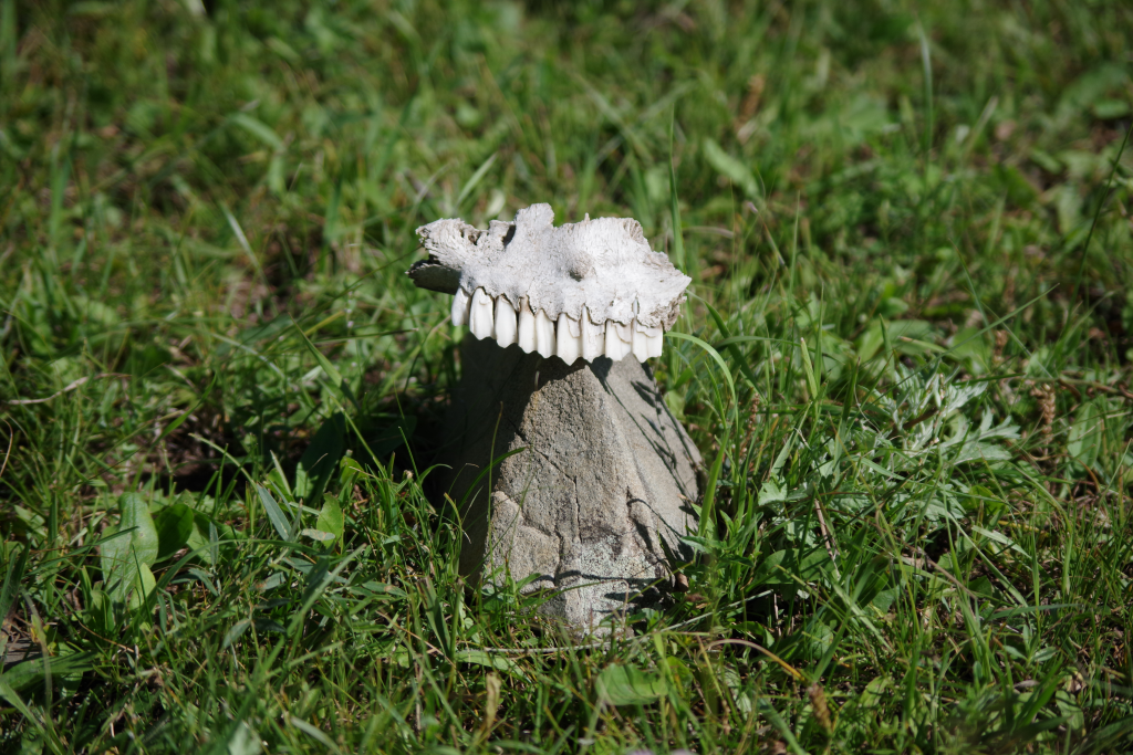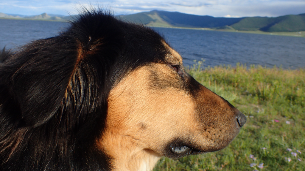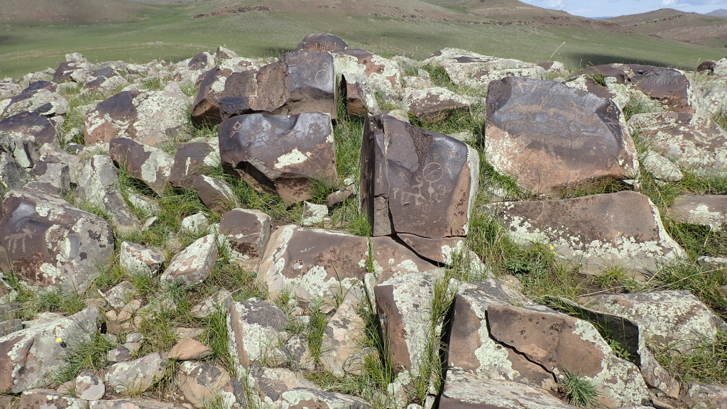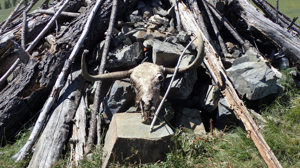On s’arrête observer des gravures mongoles de plus de 5000 ans avant de reprendre la route sous la pluie qui mouille. Les gouttes me fouettent le nez. Louis, qui a oublié ses affaires de pluie, achète le poncho le plus moche du monde au marché. Un chien mort nous attend à l’entrée de la piste qui mène au camp.