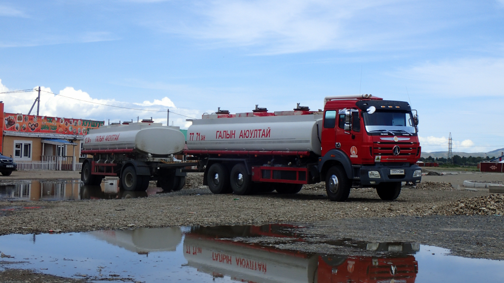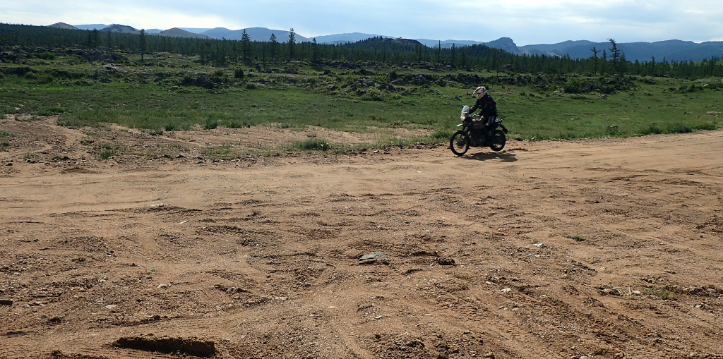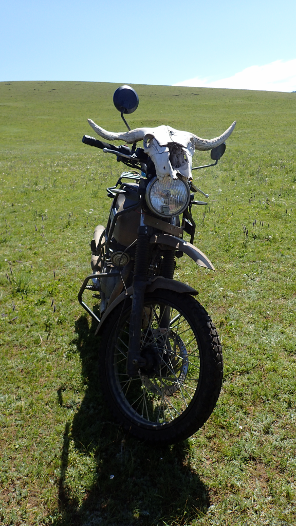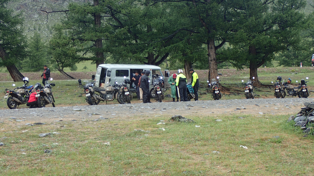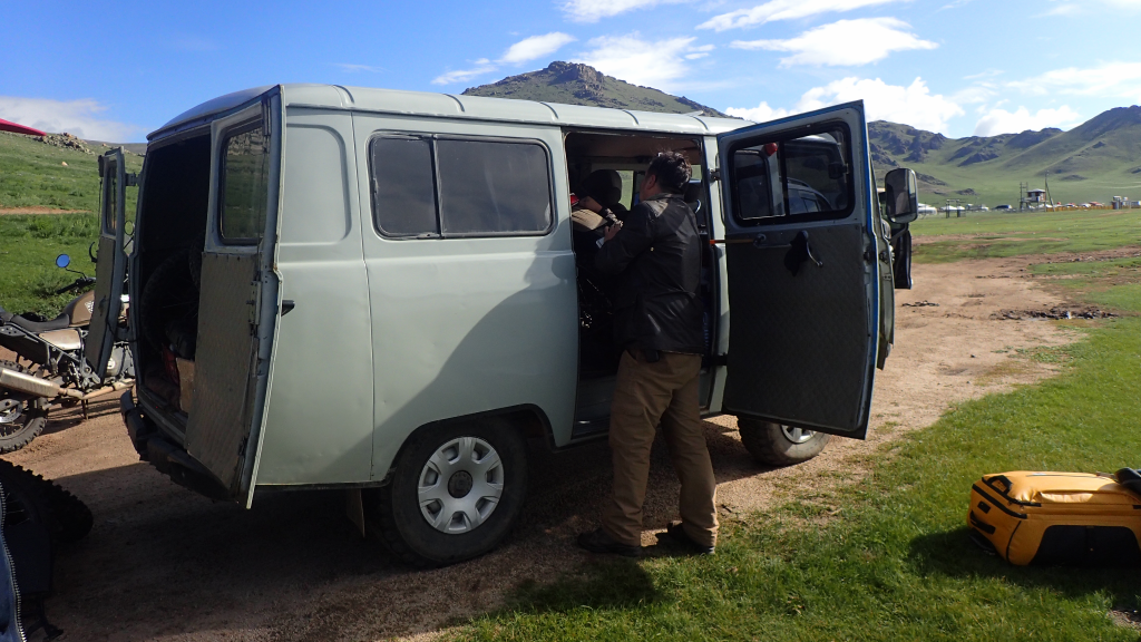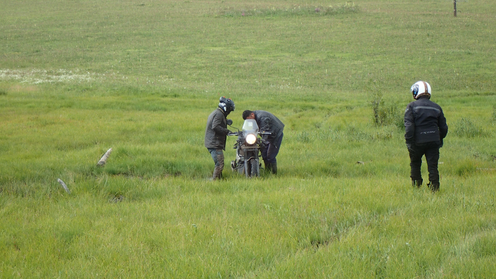 Les spaghettis bolognaises de la veille ont eu raison de Laure. Elle préfère faire la piste dans le 4×4 jusqu’à la route. On charge la moto de Kurst dans le camion russe pour la ramener à Oulan-Bator et Mogi, le mécano, prend celle de Laure. Après 10 minutes de piste, la moto de Martin rend l’âme. Chaîne de distribution cassée. On décharge la moto de Kurst du camion et recharge la moto de Martin à la place sur un air d’Alizée. Merci Tuk pour la playlist.