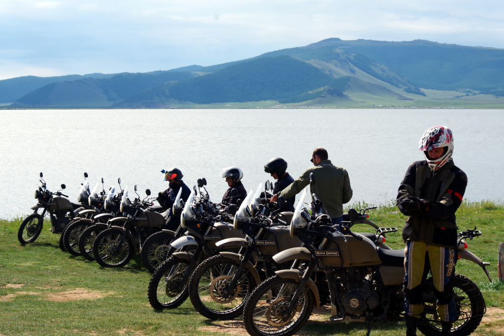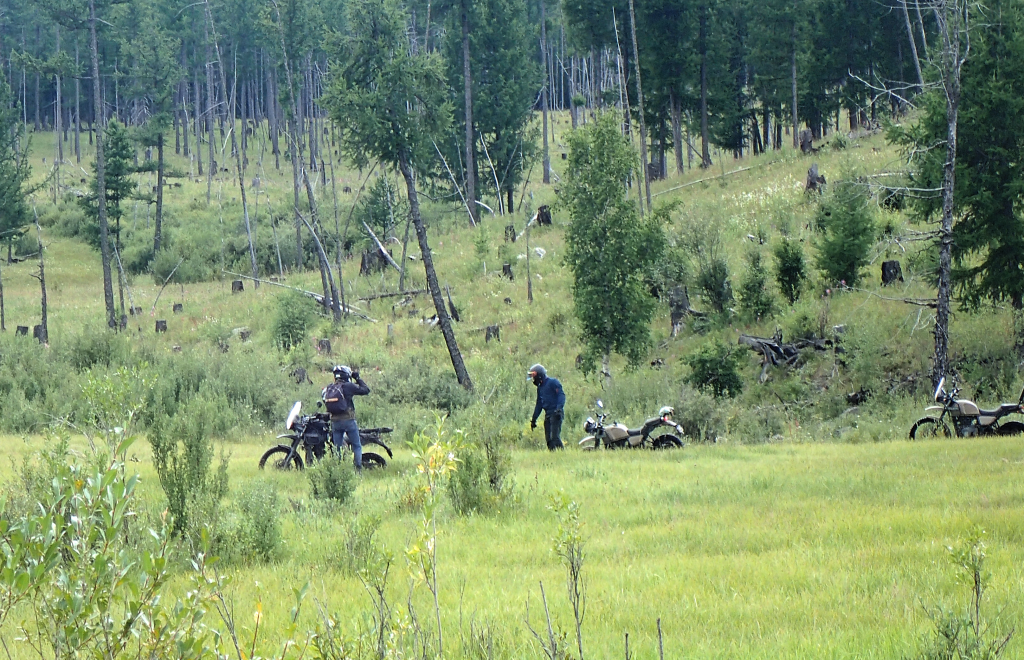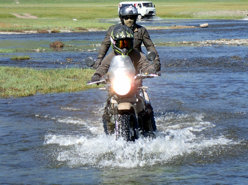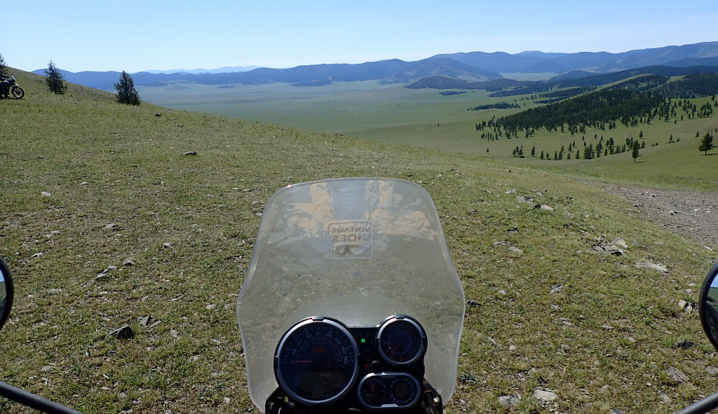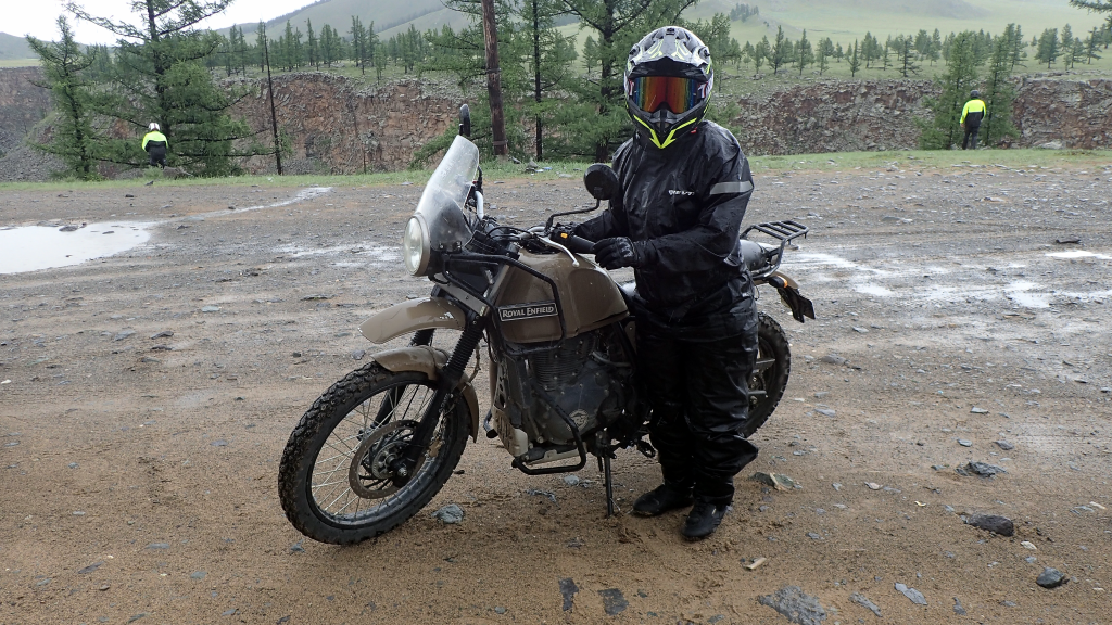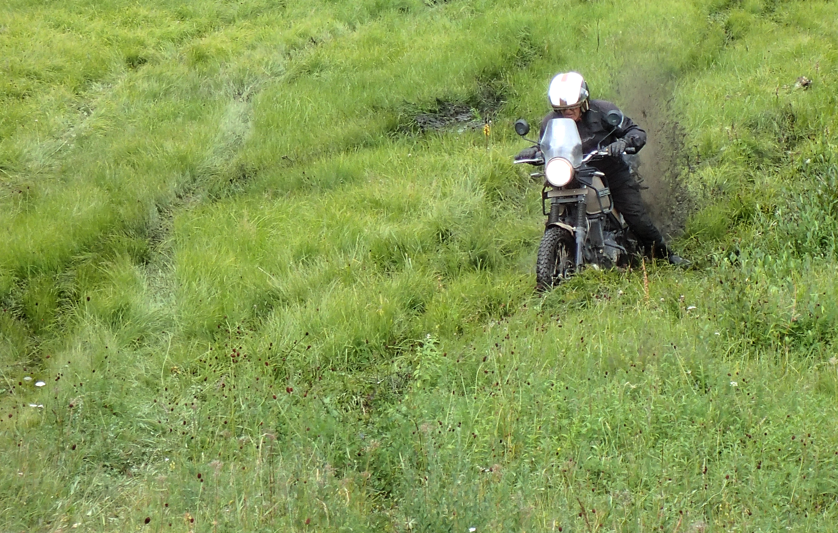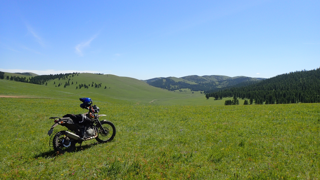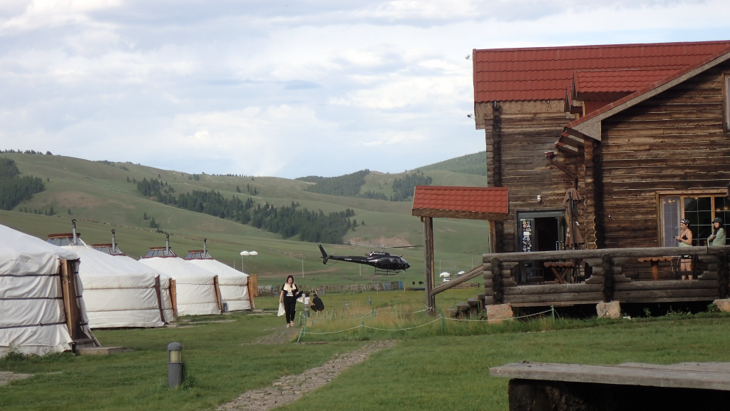 La piste continue à travers plaines et forêts. Ma moto me fait une petite blague en passant de la seconde au point mort au milieu d’une montée un peu technique. C’est une marrante l’Himalayan… On arrive au camp épuisé, mais la banane jusqu’aux oreilles et j’assiste à une scène surréaliste entre deux hélicos. Le carré de pelouse jouxtant le terrain de jeux pour enfant fait office d’héliport, et disons que les Mongols pilotent comme ils conduisent. Le klaxon en moins. En forçant le passage avec suffisamment de conviction, l’autre finira bien par se pousser.