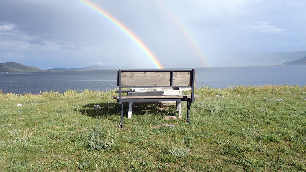Le dernier tronçon de piste est horrible. Un véritable champ de mines criblé de nids de poule. La fourche talonne tous les 3 mètres, les coups marteaux remontent dans les poignets et les épaules. On arrive finalement au Lac Blanc accueilli par un magnifique arc-en-ciel.