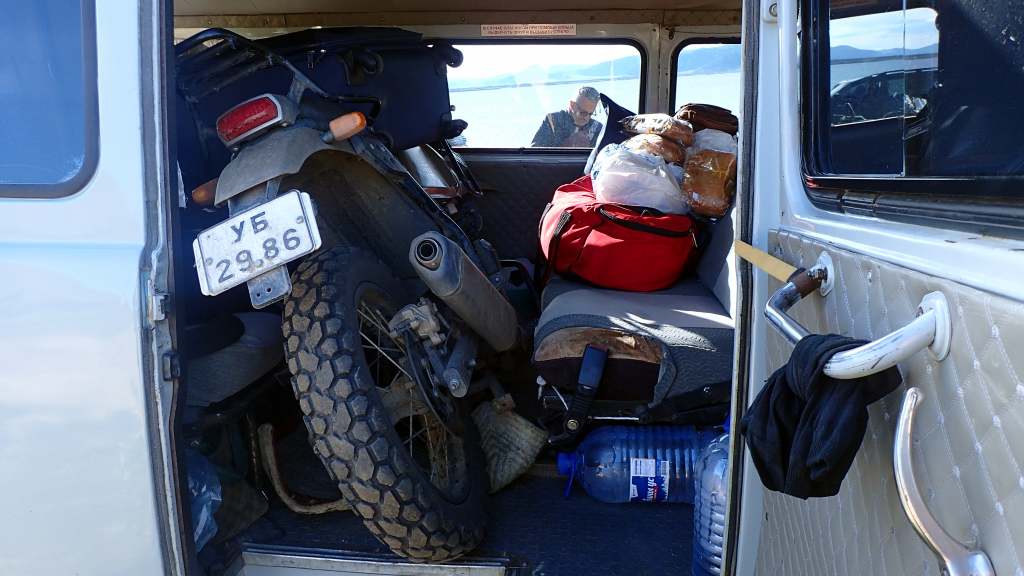 Kirsten crame sa batterie. On charge sa moto dans le camion russe pour la fin du parcours. Ce soir, dodo chez l’habitant.
